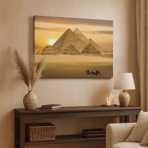 - Tento obraz zobrazuje egyptské pyramídy pri západe slnka s jazdcami na koňoch. Ideálny do interiérov inšpirovaných históriou a exotikou.