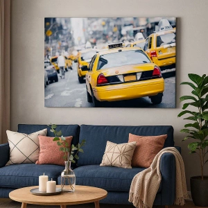 - Tento obraz zobrazuje žlté taxíky na rušnej mestskej ulici a zachytáva dynamickú atmosféru metropoly. Je to perfektný dekoratívny prvok pre milovníkov mestského štýlu.