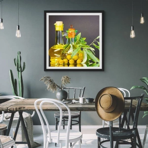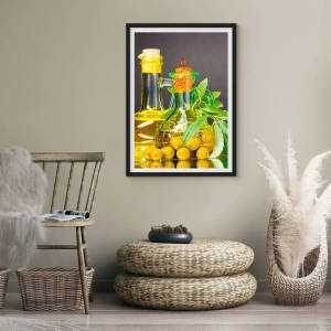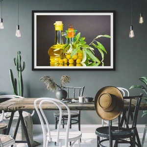 Plagát v čiernom ráme - Zátišie s olivami a olejom - 70x50 cm