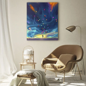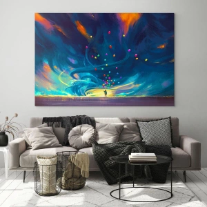 „Na niebieska vítr“ je obraz plný farieb, energie a snov, ideálny pre interiéry, ktoré si cenia radosť, optimizmus a slobodu. Balóny proti vetru vytvárajú priestor plný symboliky, vďaka čomu je tento obraz určite upútavý a stane sa ústredným bodom každého interiéru.