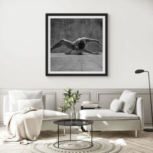 Plagát v čiernom ráme - Tanečník v umeleckej póze na drevenom javisku - 50x70cm - Nájdená symetria - Moderná nástenná dekorácia do obývacej izby a spálne ARTTOR