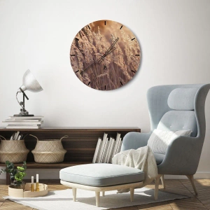 - Hodiny zobrazujú zlaté trávy, ktoré sa v lúčoch zapadajúceho jesenného slnka vlnia vo vetre. Prírodná kompozícia plná teplých tónov prináša do interiéru atmosféru pokoja a čaro prírody.