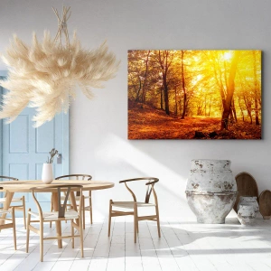 • Obraz zobrazujúci jesennú čistinku s lesným chodníkom v zlatom slnečnom svetle. Atmosférická a malebná kompozícia, ktorá prináša do interiéru harmóniu a krásu prírody.