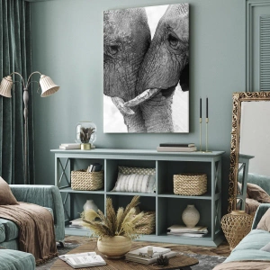 - Dva slony v nežnom geste, prezentované v monochromatických tónoch. Jedinečný obraz, ktorý vnesie harmóniu a eleganciu do každého interiéru.