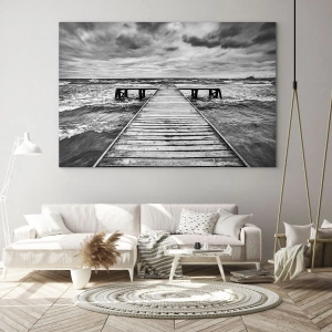 - Obraz zobrazuje čiernobiele mólo obklopené víriacimi sa vlnami. Melancholická atmosféra a minimalistický štýl prinesú jasnosť a harmóniu do každého interiéru.