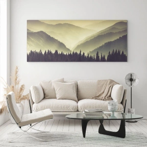 Obraz na skle - Hmlistý pohľad na pohorie s tmavým lesom v popredí - 70x50cm - Za siedmimi horami… - Moderná nástenná dekorácia do obývacej izby a spálne ARTTOR