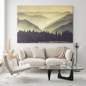 - Atmosférická krajina hmlistých hôr s tmavým lesom v popredí. Ideálny obraz do interiérov inšpirovaných prírodou, prináša harmóniu a pokoj.