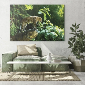 - Tento sklenený obraz zobrazuje majestátneho leoparda stojaceho na skale v tropickej džungli. Hustá vegetácia a prirodzené svetlo zdôrazňujú dravosť a silu tohto predátora a vytvárajú pozoruhodne realistickú nástennú dekoráciu.