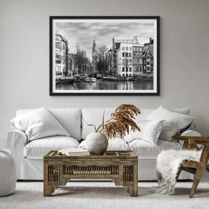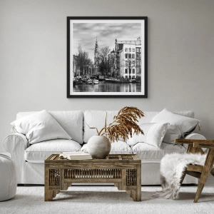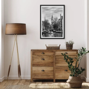 Plagát v čiernom ráme - Čiernobiely pohľad na kanál s historickou vežou v pozadí. - 50x70cm - Amsterdamské vibrácie - Moderná nástenná dekorácia do obývacej izby a spálne ARTTOR