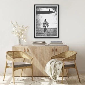 Plagát v čiernom ráme - Silueta cyklistu s odrazom v mláke v čiernobielom štýle - 50x70cm - Dopredu, cez mesto - Moderná nástenná dekorácia do obývacej izby a spálne ARTTOR