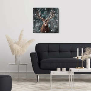 - Tieto nástenné hodiny zobrazujú majestátneho jeleňa stojaceho v zimnom lese. Zasnežená scenéria a hrdo zdvihnuté parohy vytvárajú obraz sily, pokoja a prirodzenej harmónie.