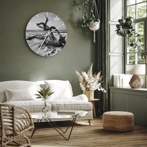 - Tieto nástenné hodiny zobrazujú čiernobielu fotografiu prímorskej krajiny s popadaným konárom na pozadí piesku a mora. Táto umelecká a minimalistická kompozícia evokuje atmosféru ticha a kontemplácie.