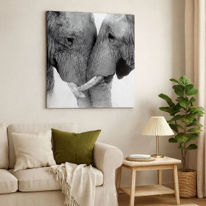 - Dva slony v nežnom geste, prezentované v monochromatických tónoch. Jedinečný obraz, ktorý vnesie harmóniu a eleganciu do každého interiéru.