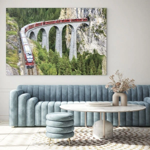 Vlak prechádzajúci cez horský most na pozadí krásnej zelenej krajiny je námetom obrazu „Železničná cesta k horským výhľadom“. Most na tomto zábere je súčasťou švajčiarskej železničnej trate a v pozadí môžete vidieť malebné hory a lesy. Toto umelecké dielo berie diváka na cestu po horských chodníkoch a ukazuje krásu prírody a nezabudnuteľné výhľady. Vlak vo svojich červených vagónoch sa týči nad údolím a vytvára nádherný kontrast s drsnými vrcholmi.