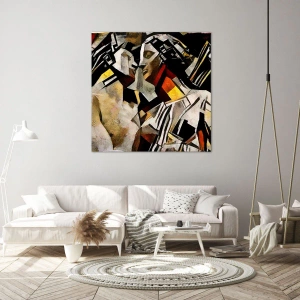 Farebná schéma obrazu je založená na prírodných zemitých tónoch, ktoré dodávajú kompozícii hĺbku a teplo. Detaily, ako sú jemné farebné prechody a kontrastné geometrické línie, zdôrazňujú umelecký charakter diela. Je to perfektná voľba pre tých, ktorí si cenia umenie a chcú dať svojmu interiéru jedinečný, moderný štýl.
