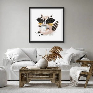 Plagát v čiernom ráme - Kresba mývala v šatke, ktorý drží šálku čaju. - 50x70cm - Môj priateľ mýval - Moderná nástenná dekorácia do obývacej izby a spálne ARTTOR