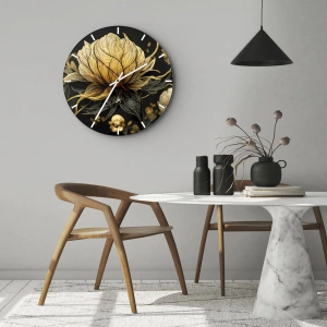 - Hodiny s výrazným zlatým a čiernym kvetinovým motívom na okrúhlom sklenenom ciferníku s rozmermi 30 x 30 cm. Vzor dodá eleganciu a umelecký výraz každému interiéru. Ideálne do štýlových domácich priestorov.