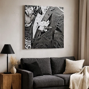 - Obraz zobrazuje elegantnú abstrakciu muža v obleku, vyhotovenú v čiernobielej farbe. Je výrazným doplnkom klasických aj moderných interiérov.