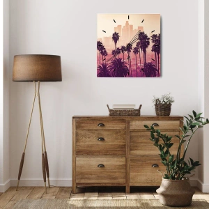 Nástenné hodiny - Západ slnka s palmami a panorámou mesta - 30x30cm - Kalifornská krajinka - Moderná nástenná dekorácia do obývacej izby, kuchyne a spálne ARTTOR