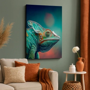 - Obraz na plátne s chameleónom v žiarivej zelenej a oranžovej farbe. Výrazná a exotická kompozícia, ideálna do moderných interiérov.