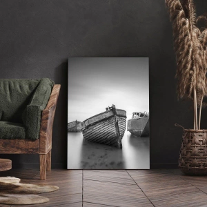 - Obraz zobrazuje opustené lode odpočívajúce na pokojnej vodnej hladine v čiernobielej estetike. Jemná krajina plná nostalgie a reflexie, ideálna do minimalistických alebo klasických interiérov.