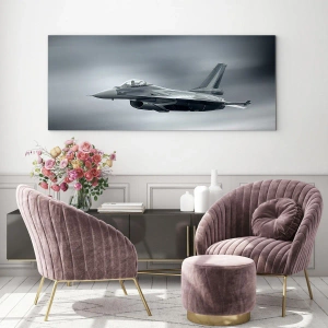Sklenený obraz "Stíhačka za letu" je jedinečné dielo, ktoré dokonale kombinuje technológiu, dynamiku a eleganciu. Hlavným motívom je vojenská stíhačka zachytená za letu na pozadí zamračenej, monochromatickej oblohy. Minimalistické farby a moderný štýl dodávajú obrazu jedinečný charakter.