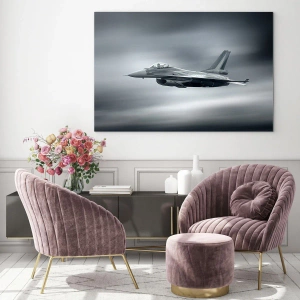 - Tento čiernobiely obraz zobrazuje stíhačku za letu na pozadí zamračenej oblohy. Minimalistická a moderná dekorácia ideálna pre nadšencov letectva a technológií.