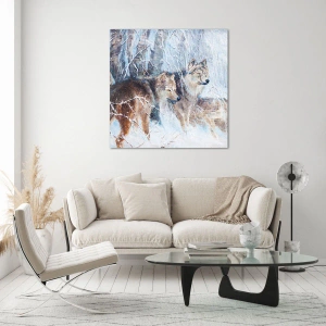 Kompozícia zobrazuje svorku vlkov v ich prirodzenom prostredí. Zimná lesná scenéria s dominantnými odtieňmi bielej, sivej a hnedej dodáva obrazu realistický charakter. Expresívne detaily a jemné tieňovanie vytvárajú dojem, akoby vlci vystupovali z obrazu, čo dodáva celej kompozícii dynamiku a hĺbku.