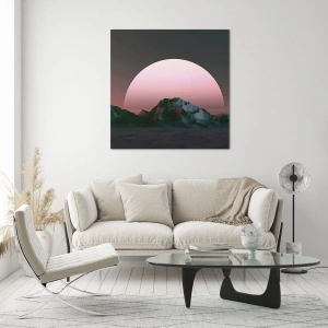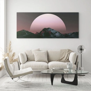 - Obraz zobrazuje abstraktnú krajinu s geometrickými horami a pastelovo ružovým slnkom na tmavom pozadí. Je to perfektná voľba pre moderné interiéry.