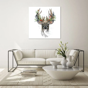 - Obraz zobrazuje portrét jeleňa s vianočnými ozdobami, konármi a bobuľami. Produkt je vyrobený na skle.