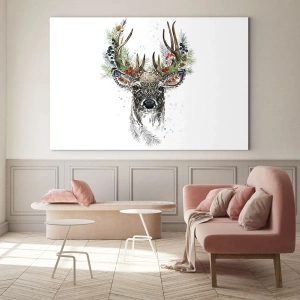 Obraz „Vo vianočnom rúchu“ zobrazuje jeleňa ozdobeného kvetinovými akcentmi. Je to obraz plný mágie zimného lesa a tepla sviatočného obdobia.