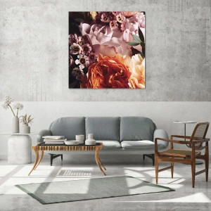 Obraz na skle - Detailný záber na kompozíciu z ruží, karafiátov a malých kvetov. - 70x50cm - Zabalené do krásy - Moderná nástenná dekorácia do obývacej izby a spálne ARTTOR