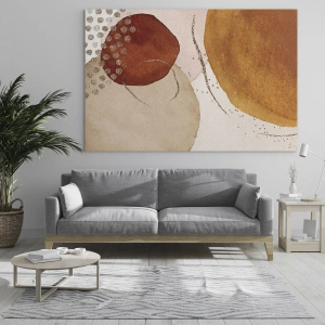 - Obraz zobrazuje abstraktné kruhy v odtieňoch béžovej, hnedej a zlatej, ktoré vytvárajú harmonickú a elegantnú kompozíciu. Farby a jemné tvary dodávajú dielu teplý a moderný charakter.