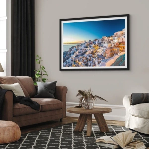 Plagát v čiernom ráme - Pohľad na osvetlené domy na Santorini pri západe slnka - 50x70cm - Esencia Grécka - Moderná nástenná dekorácia do obývacej izby a spálne ARTTOR
