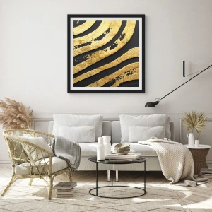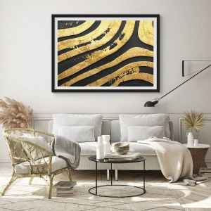 Plagát „Zlaté čiary“ je k dispozícii vo formáte 50x70 cm a dodáva sa s čiernym rámom, vďaka čomu je pripravený na zavesenie. Jeho elegantný rám dodáva celému dielu sofistikovaný vzhľad.