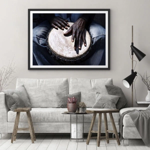 Plagát v čiernom ráme - Ruky hrajúce na bubne djembe v rytmickej hre - 50x70cm - Žite vo svojom rytme - Moderná nástenná dekorácia do obývacej izby a spálne ARTTOR