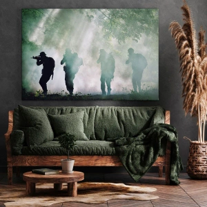 Obraz na plátne - Siluety vojakov v lese obklopenom hmlou - 70x50cm - Jeden za všetkých… - Moderná nástenná dekorácia do obývacej izby a spálne ARTTOR
