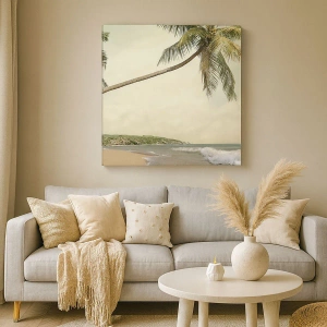 - Tento obraz zobrazuje tropickú pláž s palmami na pozadí pokojného mora. Je to perfektná voľba pre interiéry, ktoré si cenia relax a prírodnú krásu.