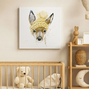 Tento horizontálny obraz na plátne s rozmermi 70x50 cm s názvom „Na zimu v zasneženom lese“ predstavuje umelecký portrét akvarelového jeleňa v žltom klobúku s brmbolcom. Minimalistický štýl a jemné akvarelové detaily dodávajú obrazu jedinečný, útulný charakter.