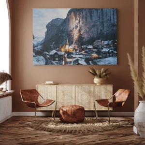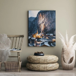 - Zimná krajina dediny obklopenej majestátnymi horami, osvetlená teplým svetlom. Dokonalá dekorácia pre milovníkov zimnej krajiny.