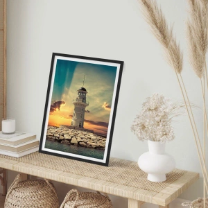 Plagát v čiernom ráme - Maják pri západe slnka - 50x70cm - Svetlo - Dobro - Krása - Moderná nástenná dekorácia do obývacej izby a spálne ARTTOR