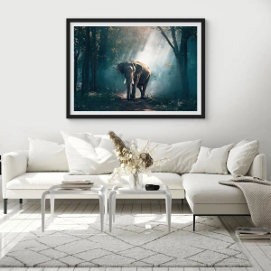 - Plagát zobrazujúci slona v hustom lese osvetlenom slnečným svetlom, ktorý do interiéru vnáša exotickú atmosféru a harmóniu.