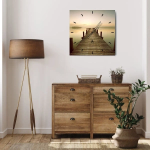 - Nástenné hodiny s výhľadom na drevené mólo pri východe slnka. Decentný doplnok, ktorý vnesie harmóniu a pokoj do každého interiéru.