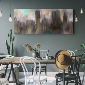 Kompozícia z ocele, kameňa a hmly je plátno, ktoré zobrazuje jemnú a umeleckú mestskú krajinu s mrakodrapmi v pastelových odtieňoch. Táto jedinečná kompozícia prináša atmosférický a inšpiratívny akcent do každého interiéru.