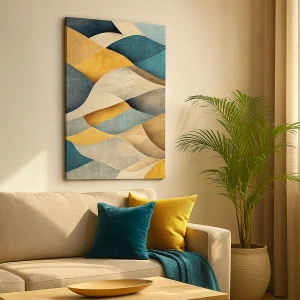 • Obraz zobrazuje abstraktné vlny v odtieňoch modrej a zlatej. Kompozícia sa perfektne hodí do moderných a elegantných interiérov.