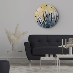 Nástenné hodiny „Studená voda, teplo slnka“ je umelecká kompozícia inšpirovaná prírodou, zobrazujúca tŕstie vo svetle zapadajúceho slnka. Obraz bol vytvorený maliarskym štýlom pripomínajúcim akvarel, ktorý mu dodáva jemnosť a jemnosť.