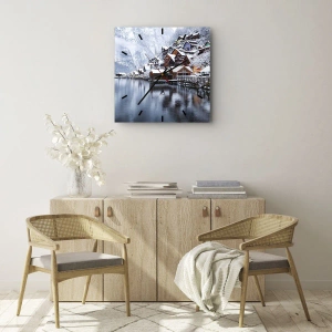 Nástenné hodiny - Zimná horská krajina s chatkami pri jazere - 30x30cm - V zimnej dekorácii - Moderná nástenná dekorácia do obývacej izby, kuchyne a spálne ARTTOR