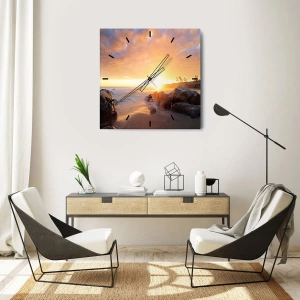 Nástenné hodiny - Západ slnka nad morom s kameňmi a teplým svetlom - 30x30cm - Svetlý večerný vánok - Moderná nástenná dekorácia do obývacej izby, kuchyne a spálne ARTTOR