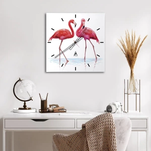 Nástenné hodiny - Ružové stretnutie - Dva ružové plameniaky stojace vo vode