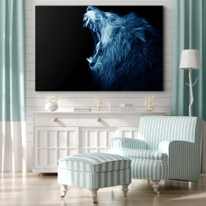 Plátno „Pôsobivá tvár leva v neónovom štýle“ je jedinečnou kombináciou umeleckého vyjadrenia a moderného dizajnu. Ústredným bodom obrazu je dynamický obraz leva zobrazený v neónovom efekte, ktorý zvýrazňuje detaily hrivy a výraznosť tváre. Kontrast medzi jasným, modrým neónovým svetlom a tmavým pozadím dodáva celej kompozícii hĺbku a intenzitu.